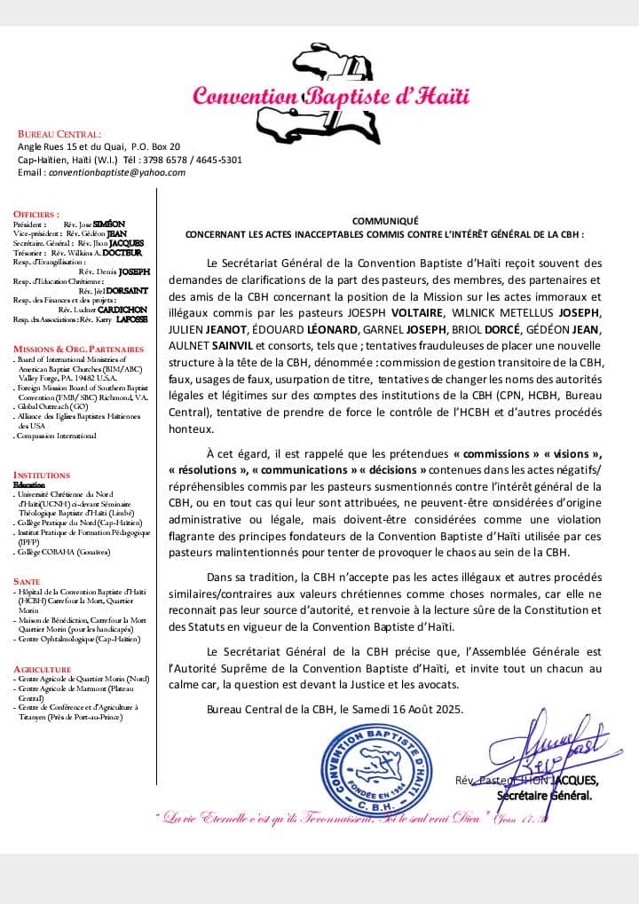 La Convention Baptiste d’Haïti (CBH) a publié, ce samedi 16 août 2025, un communiqué ferme pour dénoncer les actes jugés immoraux et illégaux commis par un groupe de pasteurs dissidents. Selon le Secrétariat général, ces derniers se seraient associés à des individus non convertis pour tenter de créer une structure parallèle et illégitime au sein de la CBH. Des pratiques telles que l’usurpation de titres, la falsification de documents, la manipulation des comptes institutionnels et la volonté de s’emparer du contrôle de plusieurs instances de l’organisation sont pointées du doigt comme des manœuvres frauduleuses et honteuses.